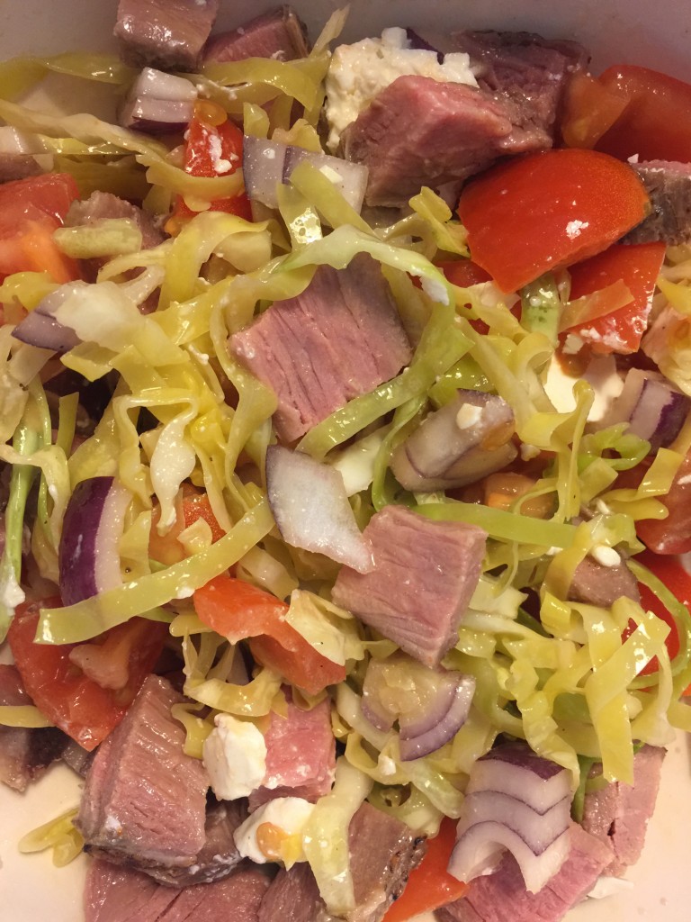 1/4 spidskål snittet fint 3 tomater i tern 1 rødløg i små tern Lidt feta Kalve cuvette – gerne en rest Dressing: 2 spsk olivenolie 1 spsk hvidvins eddike 1/2 tsk dijon sennep Ryst dressingen sammen og hæld over salaten