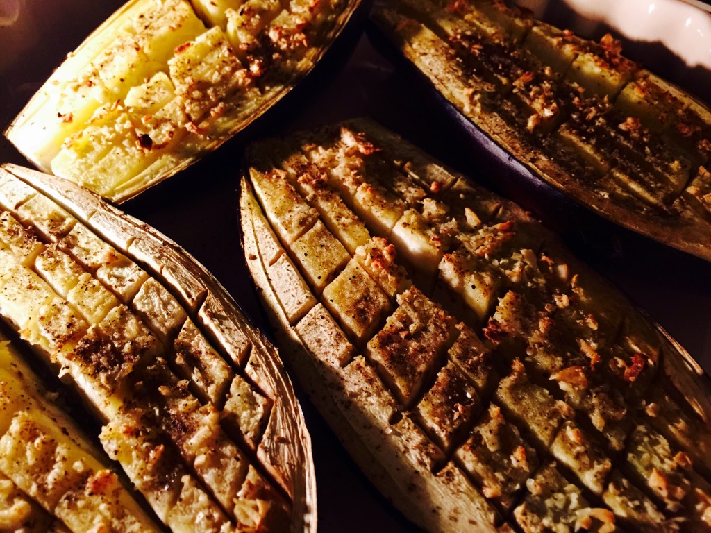 2 hele aubergine 5 fed hvidløg 5 spsk olivenolie Halverer auberginerne. Brug en urtekniv og skær tern dybt ned i kødet. Lav hvidløgsolien og fordel den udover auberginerne. Sæt dem i ovnene ved 200 g i 30 min