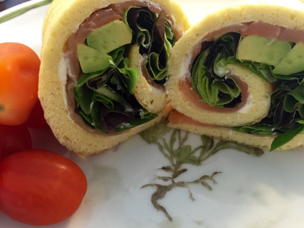 “Pandekage”: 2 æg 2 dl mandelmel Lidt salt og peber Rør det hele sammen og steg pandekagen på panden Fyld: Laks – 50 g 1/2 avokado 1 håndfuld salat Smør evt. Pandekagen med fedtfattig neutral frisk ost- ikke nødvendigt Fyld pandekagen med laks, salat og avokado. Rul den sammen og serverer:))
