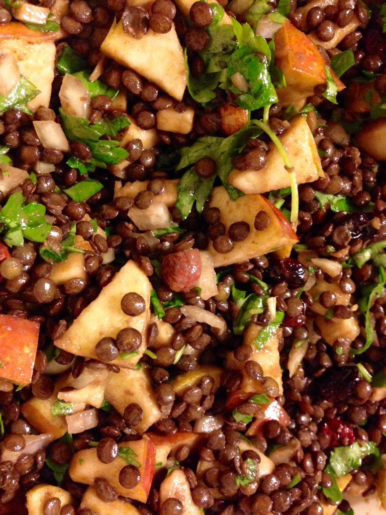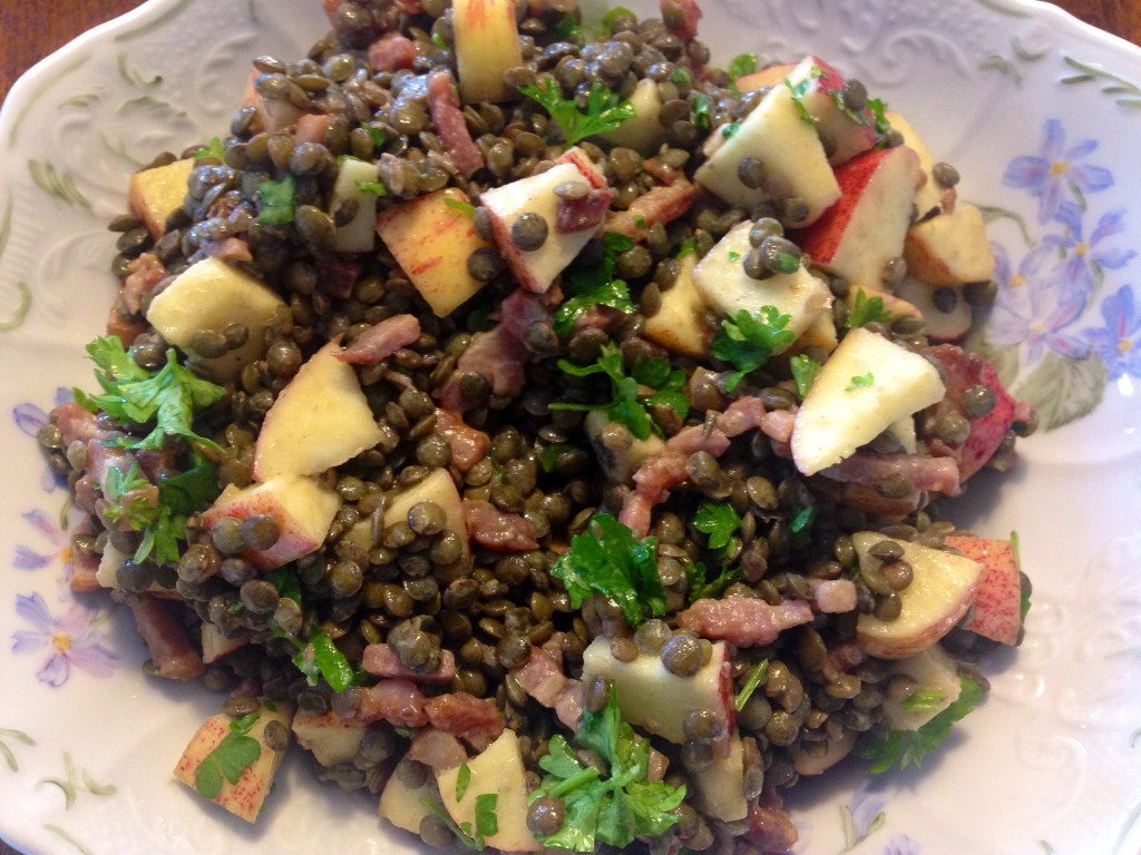 100 g grønne linser fra Le Py 2 æbler 1 håndfuld persille 50 g kalkun bacon Dressing: 1 spsk sennep 3 spsk olivenolie Kog linserne og køl dem ned. Skær æblerne i tern. Hak persillen groft. Steg bacon på panden. Bland det hele sammen og tilsæt dressing:)