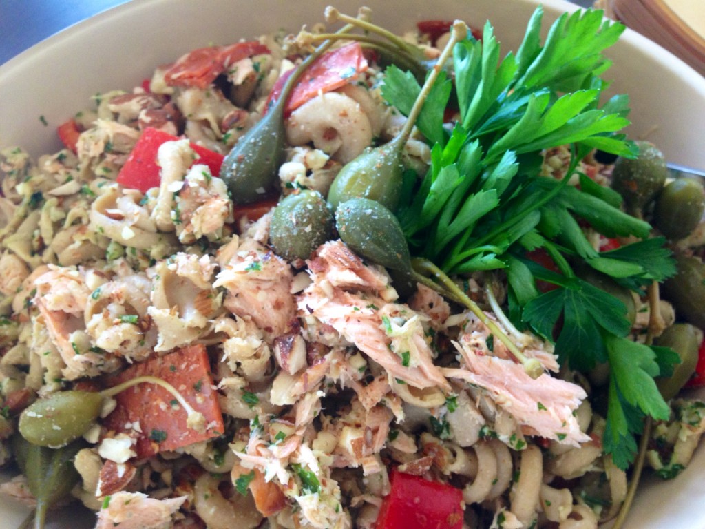 Pesto: 1,5 dl mandler 50 g parmesan 1,5 dl olivenolie 2 håndfulde persille Saften af 1/2 citron Salt og peber Rist mandlerne på panden. Blend det hele sammen til pesto- sørg for der stadig er store stykker mandler i:) Salaten: 3 peberfrugter 400 g laks 500 g fuldkorns pasta Store kapers til pynt Salt og […]