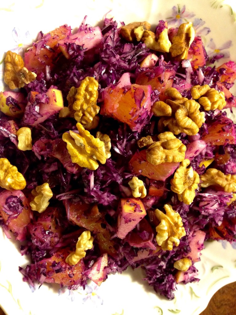 1/2 rødkål 1 æble 1 appelsin 6 dadler – kan undlades 50 g Valnødder Dressing: Saften fra 1 appelsin 2 spsk flydende honning 2 spsk oliven olie Riv eller snit rødkål. Skår appelsiner og æbler ud i små stykker Halverer dadler og skær dem i små stykker Bland det hele sammen og hæld dressingen over. […]