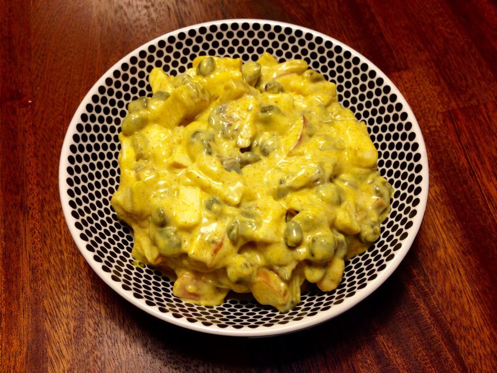 2 æbler i tern 1 lille glas kapers 1 håndfuld syltede mini agurker i tern 4 spsk ægte mayonnaise fra Rømer 1 spsk karry Bland det hele sammen. Det smager super godt på sild og andet fisk.