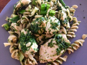 Pasta salat med kylling og spinat