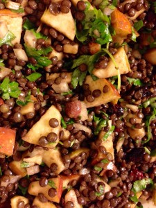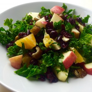 Grønkåls salat med svesker, søde kartofler og friske tranebær